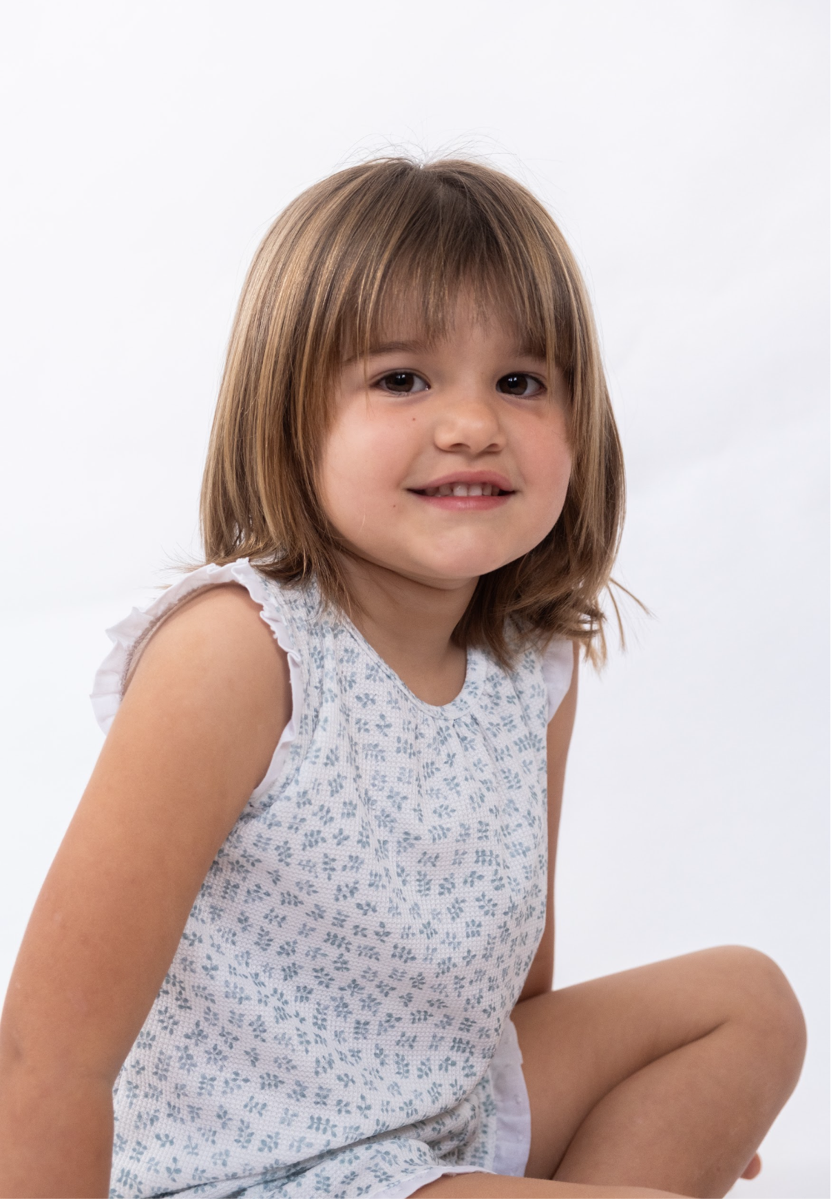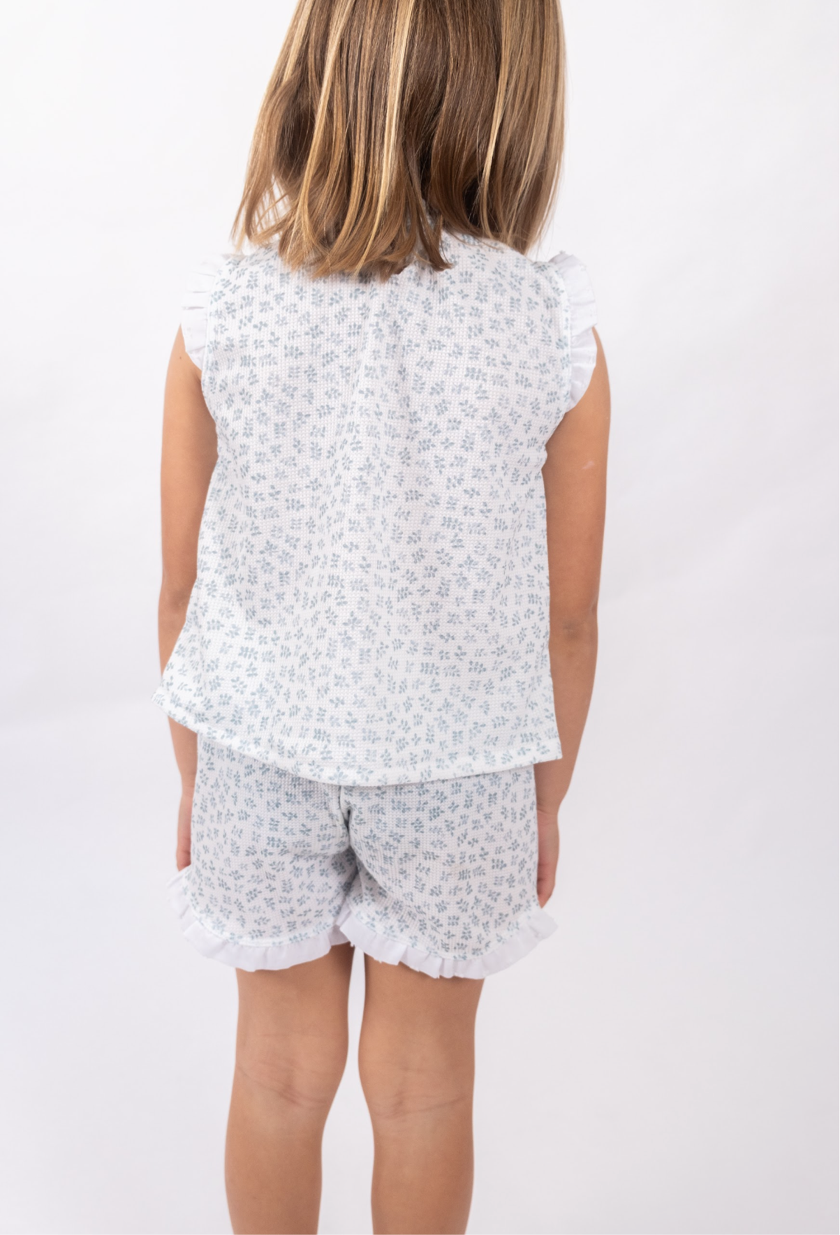 Pijama para niña en punto nido estampado con flores verdes y volado en mangas y short en plumetí blanco.